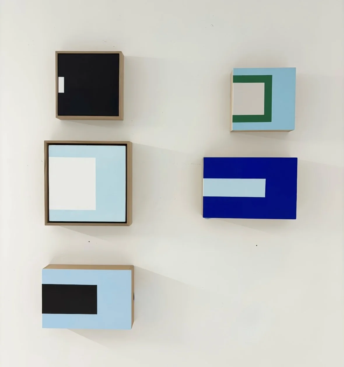 Art installation featuring five wooden boxes mounted on a white wall, minimalist designs in black, white, gray, green, light blue, and dark blue. Contemporary art. modern art