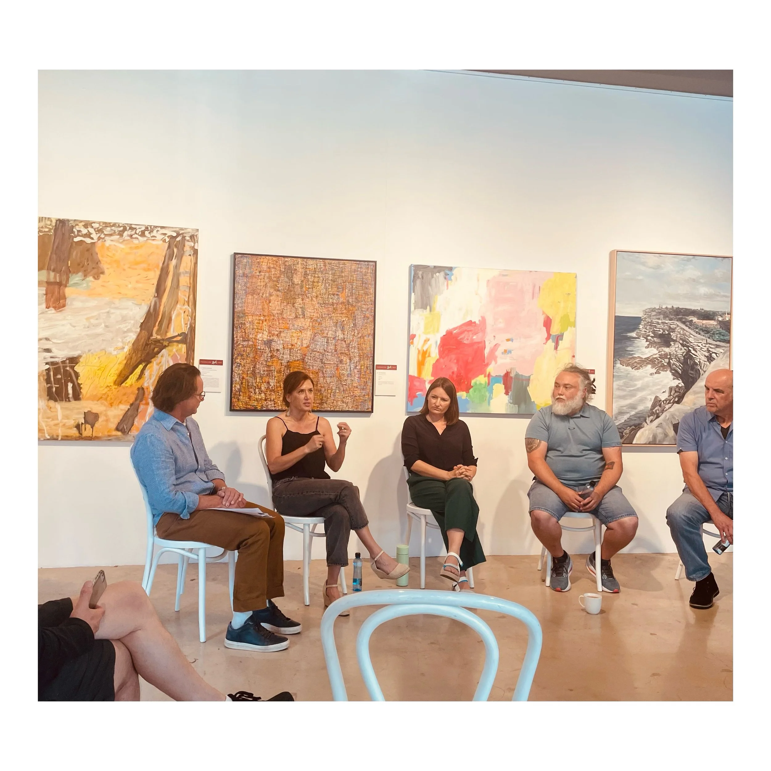 In discussion with host Chris Antico and artists Julie Nicholson, Winner Goompi Ugerabah and Stuart Watters at Cooee Art leven Gallery.